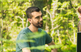 Mies kuuntelee verkkokurssia metsässä